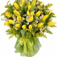 Букет из желтых тюльпанов и ромашек «Сочетание» - прекрасная смесь, несущая радость, яркость и положительные эмоции. Тюльпаны кричат об обворожительности улыбки, которая светит как солнце, а ромашки влекут за собой в поле своим непередаваемым запахом. Отличный букет, чтобы подарить заряд позитива членам семьи или близким сердцу друзьям.